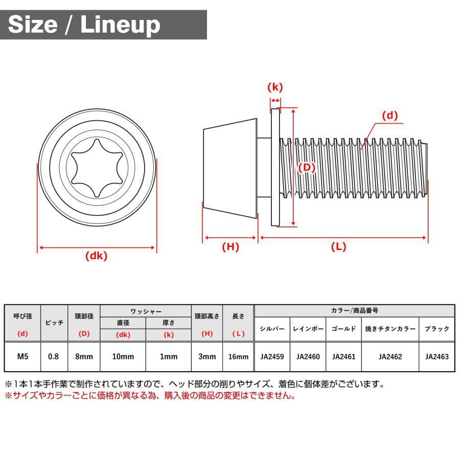 チタンボルト M5×16mm P0.8 ワッシャー組込 低頭 テーパーヘッドボルト トルクス穴付き ゴールド 1個 JA2461