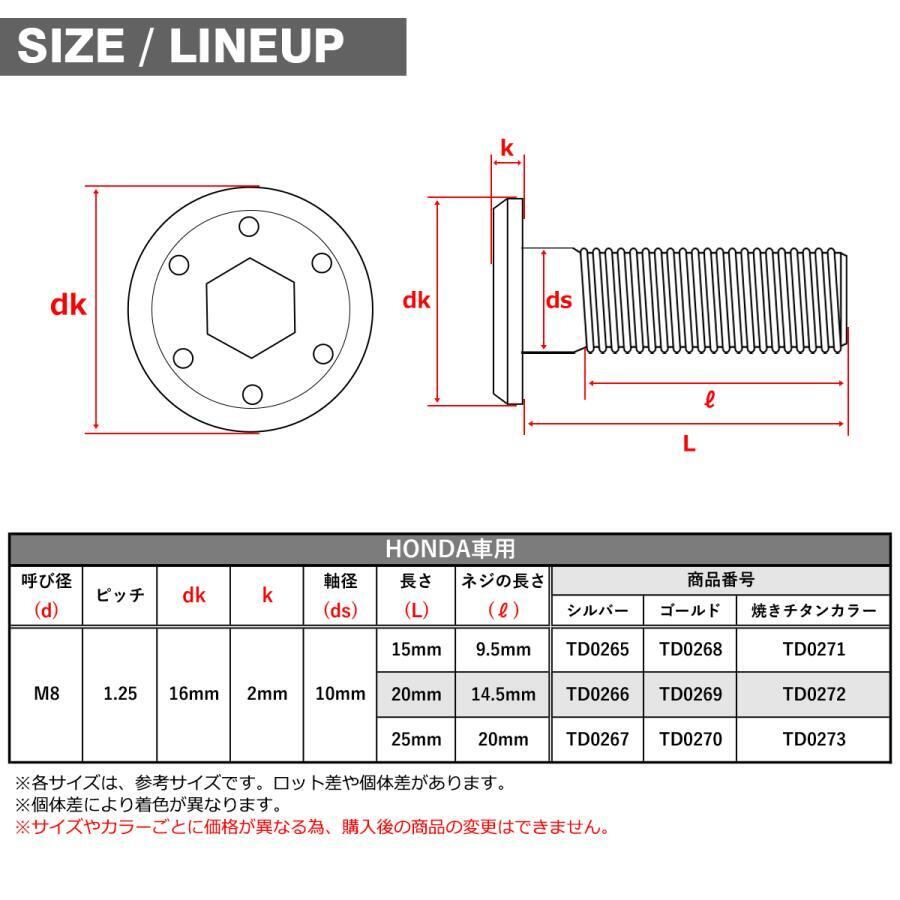 ブレーキディスク ローターボルト M8×20mm P1.25 ホンダ用 シンホールヘッド 焼きチタンカラー TD0272