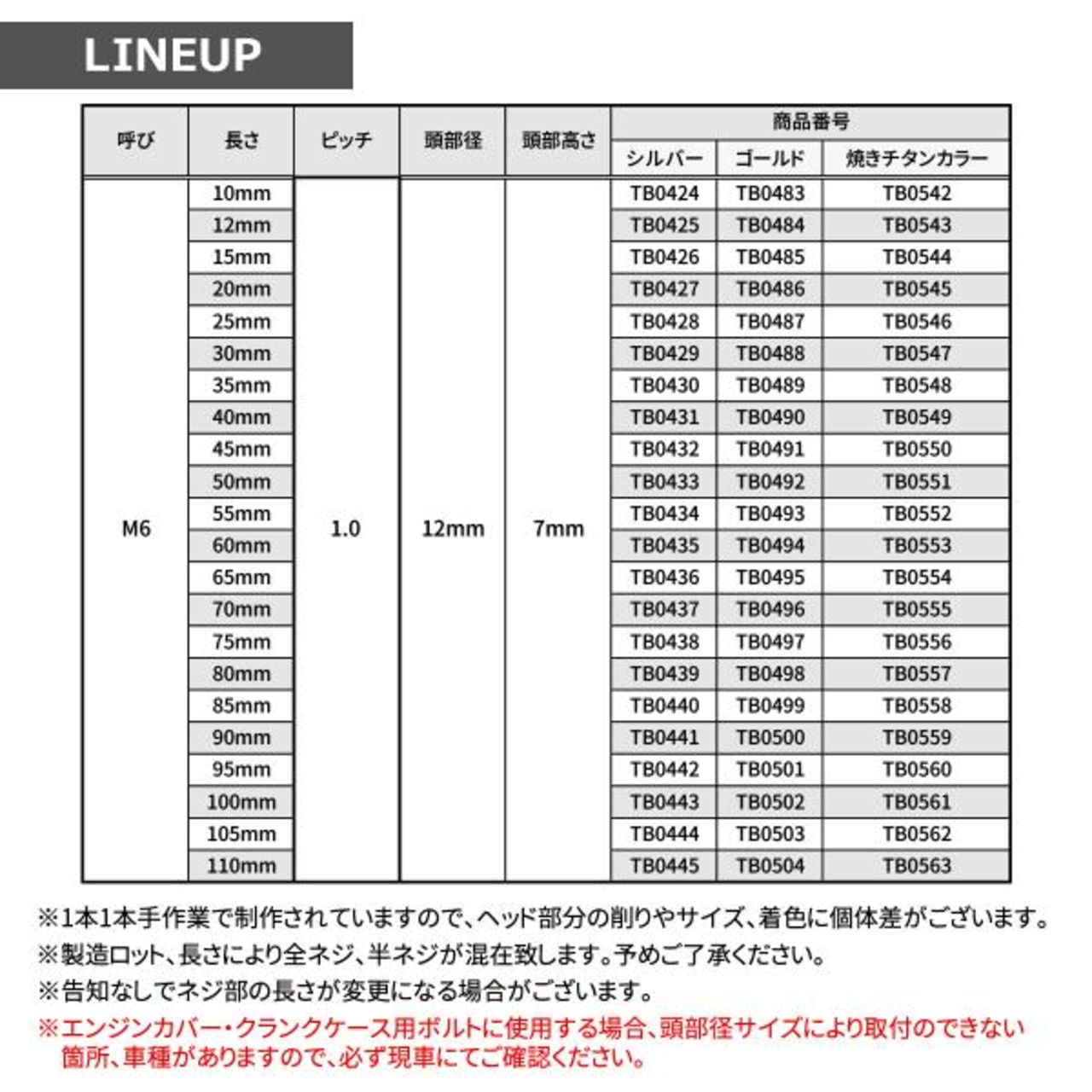 ※エンジンカバー・クランクケース用ボルトに使用する場合、頭部径サイズにより取付のできない
