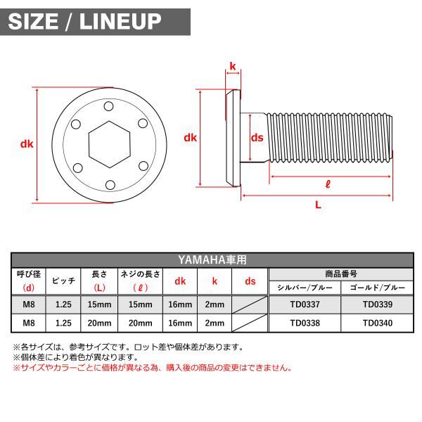 ブレーキディスク ローターボルト M8×20mm P1.25 ヤマハ用 シンホールヘッド ゴールドカラー&ブルー TD0340