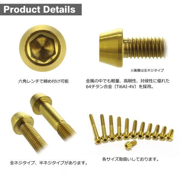 チタンボルト M5×50mm P0.8 テーパーヘッド 六角穴付き キャップボルト ゴールドカラー 金色 1個 JA379