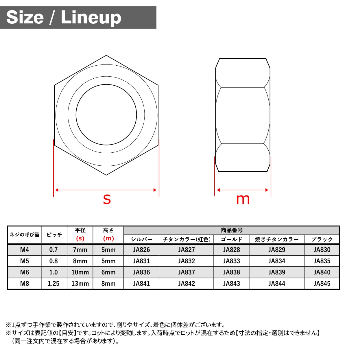 六角ナット型、ナイロンリング内蔵(サイズは画像に掲載)