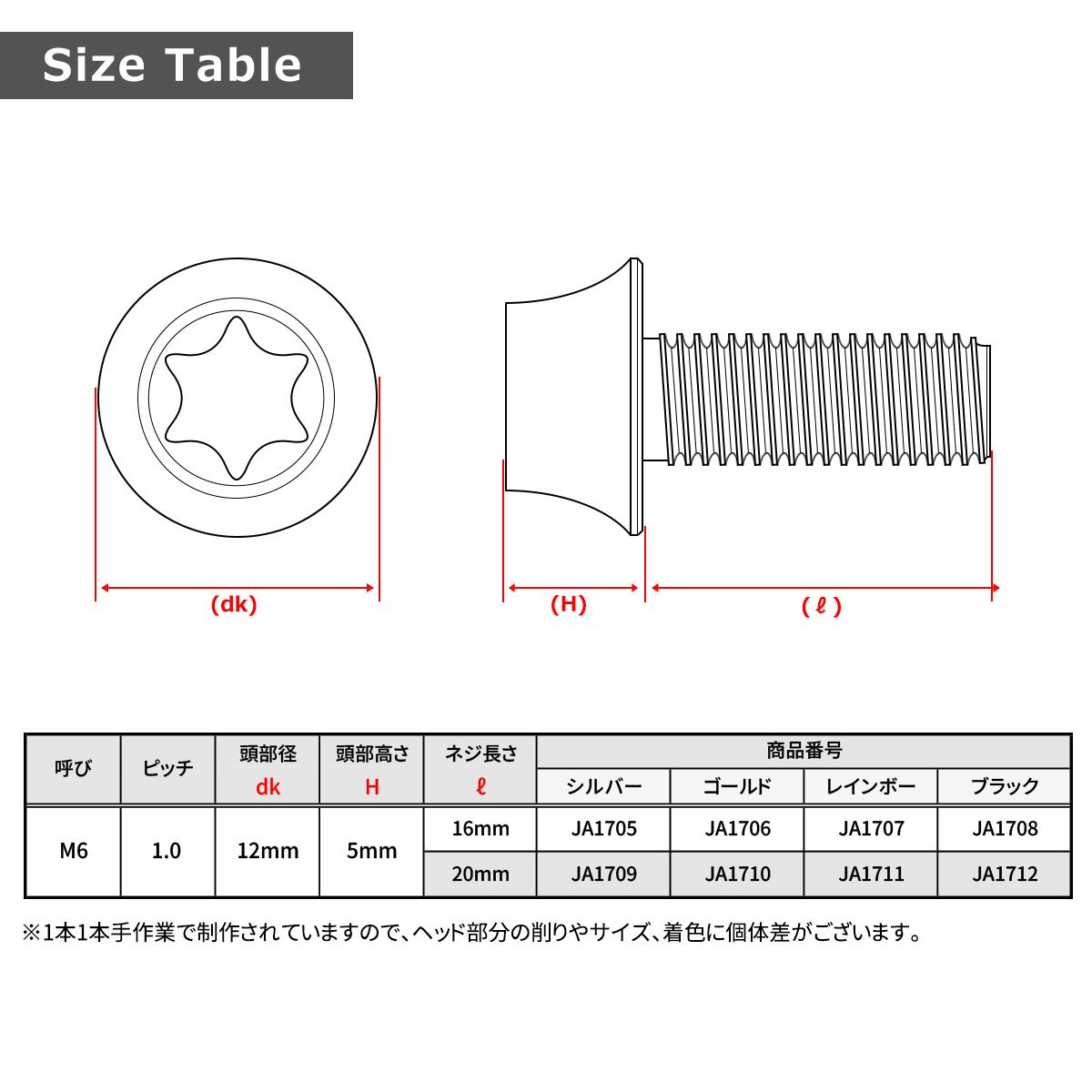 チタンボルト M6×16mm P1.0 湾曲テーパーヘッド トルクス穴 キャップボルト ブラック JA1708