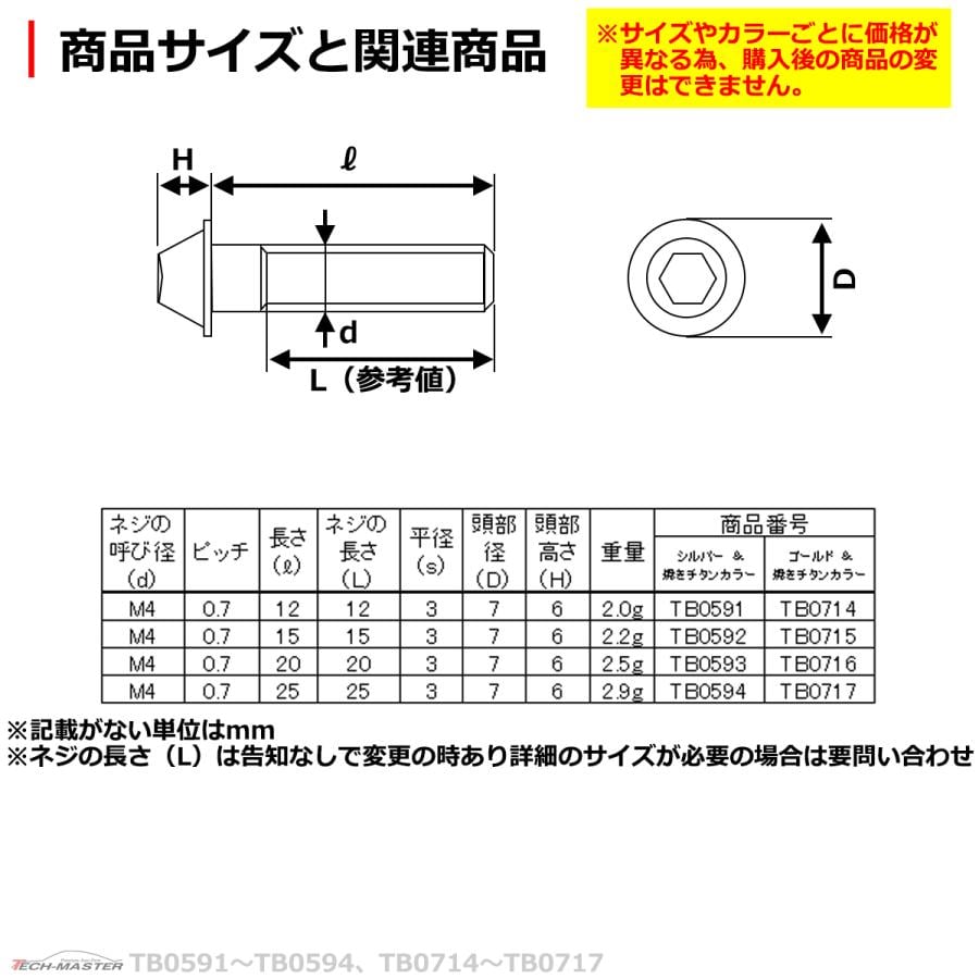 キャップボルト M4×15mm P0.7 テーパー ステンレス ゴールド&焼きチタンカラー 1個 TB0715