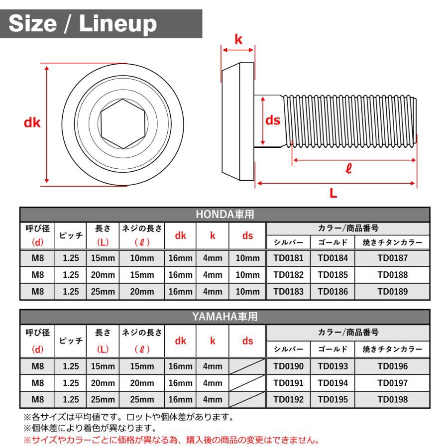 ブレーキディスク ローターボルト M8×20mm P1.25 ヤマハ用 フラットヘッド シルバーカラー TD0191